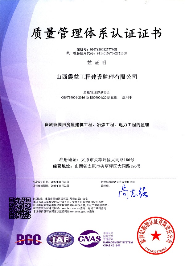 山西震益工程建設(shè)監(jiān)理有限公司【原太原鋼鐵(集團(tuán))工程建設(shè)監(jiān)理有限公司】成立于 1998年4月,注冊資金 600 萬元,是******批準(zhǔn)的具有甲級執(zhí)業(yè)資質(zhì)的綜合性工程咨詢服務(wù)企業(yè),具有冶煉工程、電力工程、礦山工程、房屋建筑工程、市政公用工程等5個(gè)工程監(jiān)理甲級資質(zhì)和設(shè)備監(jiān)理甲級資質(zhì)。主要業(yè)務(wù)涉及冶金、房屋建筑、礦山、電力、市政、機(jī)械、環(huán)保等領(lǐng)域的工程建設(shè)監(jiān)理、設(shè)備監(jiān)理、工程咨詢、造價(jià)咨詢、檢測試驗(yàn)等。公司建立了質(zhì)量ISO9001:2015標(biāo)準(zhǔn)、環(huán)境ISO14001:2015標(biāo)準(zhǔn)、職業(yè)健康******GB/T28001-2011 idt OHSAS 1800:2007標(biāo)準(zhǔn) “三標(biāo)一體”管理體系,是中國設(shè)備監(jiān)理協(xié)會(huì)常務(wù)理事、中國冶金建設(shè)監(jiān)理協(xié)會(huì)常務(wù)理事和山西省監(jiān)理協(xié)會(huì)副會(huì)長單位。